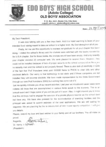 Firstly let me use this opportunity to express our gratitude for all your chapter has been doing. I visited the school library and the shelves were adorned with the books donated by the U.S.A chapter. But if not for those books the shelves would have been empty. Said Dr Oghoator